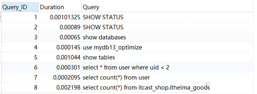 show databases; use mydb13_optimize; show tables; select * from user where id <p><strong>执行完上述命令之后,再执行show profiles 指令, 来查看SQL语句执行的耗时:</strong></p> <pre class="brush:sql;">show profiles;