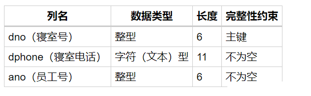 寝室(寝室号、寝室电话、员工号) 主键:寝室号 外键:员工号
