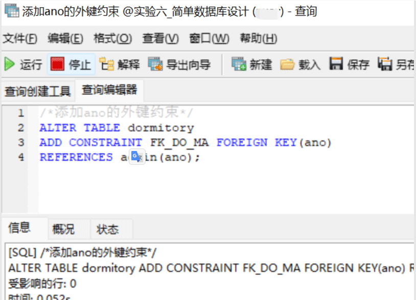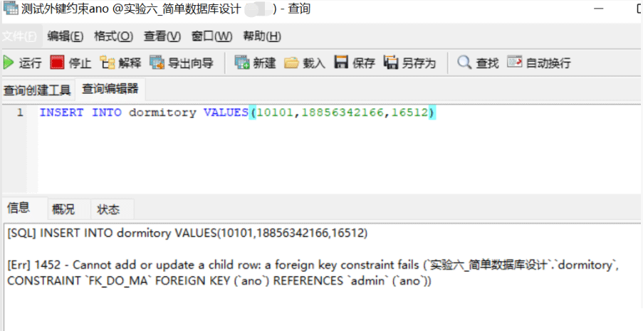 因为有外键的约束,故无法在dormitory表中加入的数据中的ano跟admin表中的数据ano不一样。