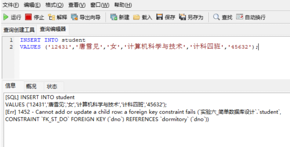 因为有外键的约束,故无法在student表中加入的数据中的dno跟dormitory表中的数据dno不一样。