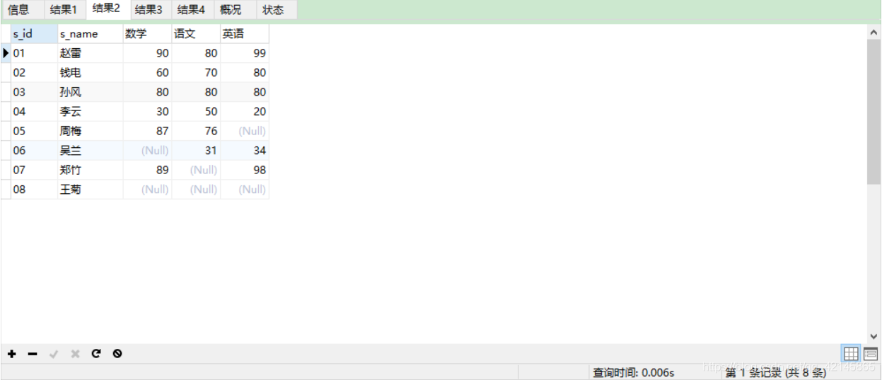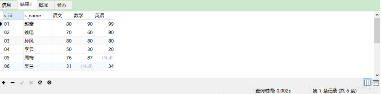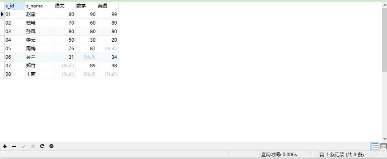 有三张表,学生表、成绩表和课程表,我们可以通过连表查询出学生姓名、课程及对应的成绩: 所需表sql