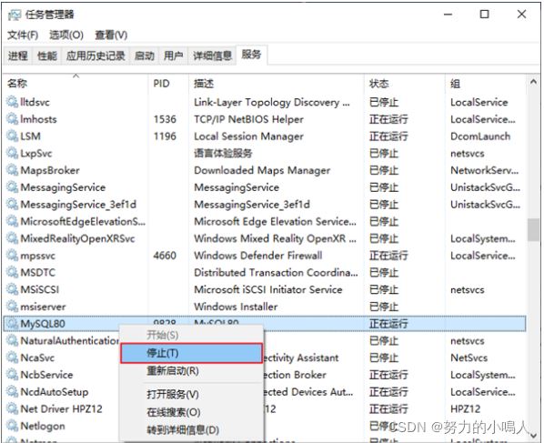 Ctrl + Alt + Delete 组合键,打开 任务管理器对话框,可以在 服务 列表找到 MySQL8.0 的服务,如果现在“正在运行”状态,可以右键单击服务,选择“停 ”选项停止MySQL8.0的服务