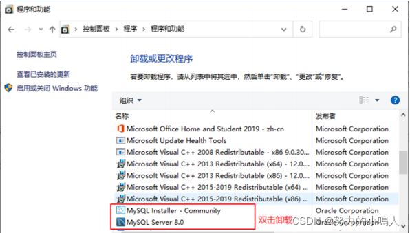 卸载MySQL8.0的程序可以和其他桌面应用程序一样直接在“控制面板”选择“卸载程序”,并在程序列表中 找到MySQL8.0服务器程序,双击卸载