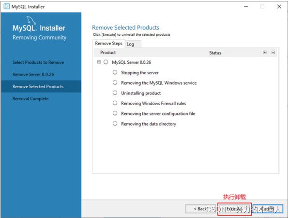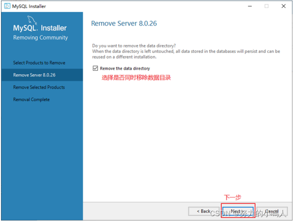 如果想要同时删除MySQL服务器中的数据,则勾选 Remove the data directory