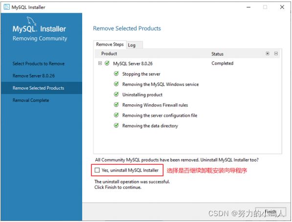 如果想要同时卸载MySQL8.0的安装向导程序,勾选 Yes,Uninstall MySQL Installer