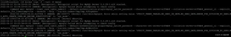 于是查看错误信息 docker logs -f --tail 10 mysql,出现报错: