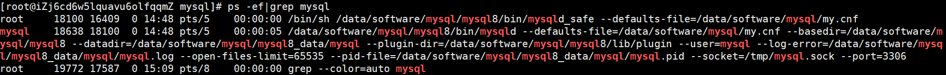 # 完整命令 /data/software/mysql8/bin/mysqld_safe --defaults-file=/data/software/mysql8/my.cnf & # 添加PATH变量后的命令(省略bin目录的路径) mysqld_safe --defaults-file=/data/software/mysql/my.cnf &