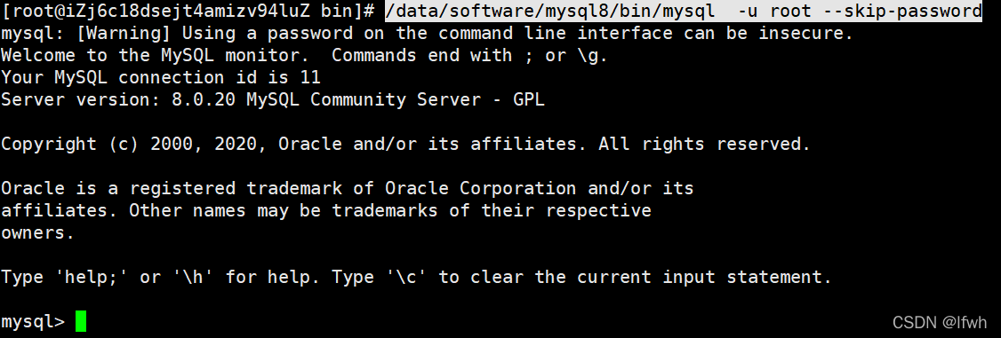 # 无密码登录方式 /data/software/mysql8/bin/mysql -u root --skip-password # 有密码登录方式(初始的随机密码在/data/mysql8_data/mysql/mysql.log下) mysql -u root -p password:随机密码