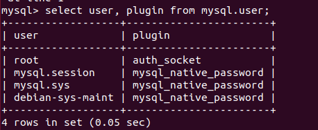 mysql> select user, plugin from mysql.user;