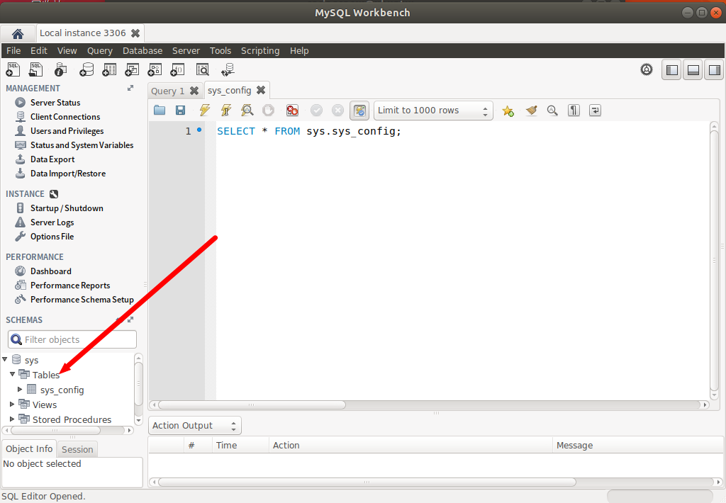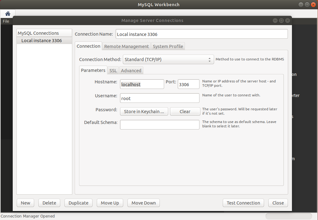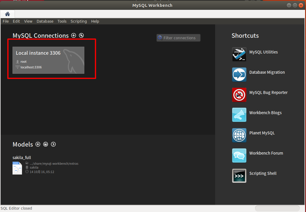 您可以通过键入 mysql-workbench 或单击 MySQL Workbench 图标 (Activities -> MySQL Workbench) 从命令行启动它。