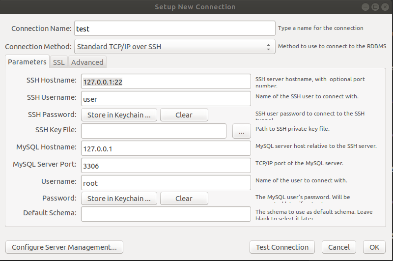 将打开一个新窗口 “Setup New Connection form”。在此示例中,我们将通过 SSH 连接到远程服务器。在“Connection name”字段中输入有意义的名称,然后 Standard TCP/IP over SSH 从“连接方法”下拉列表中进行选择。