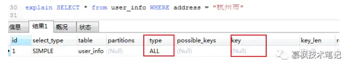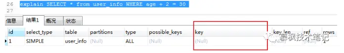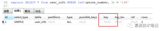 进行 SQL 数据查询的时候,where 条件字段类型与实际表中字段类型不匹配的时候,Mysql 会进行隐式的数据类型转换,而类型转换会使用到内置函数,导致在进行数据查询的时候并没有使用索引。我们可以使用 explain 命令查看 sql 语句。可以看的出来在 key 栏中,对应的值为 null,说明并没有使用索引进行查询。
