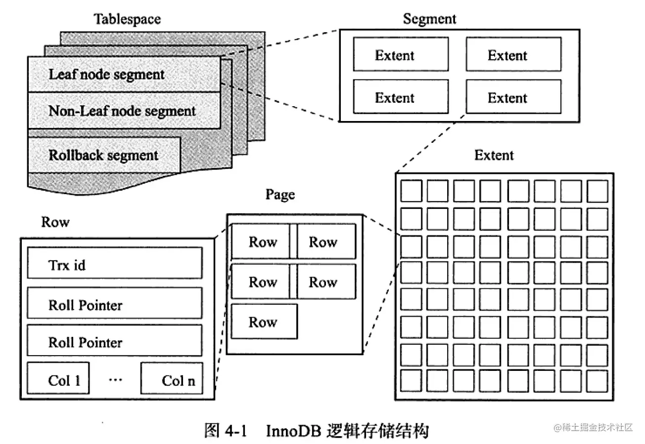 每个表空间由 段 segment 区 extent 页 page 组成。页是数据存储数据的基本单位,默认大小为 16kb。 区是由连续页组成的空间,默认大小为 1MB。多个区构成表的段。 InnoDB 逻辑存储结构
