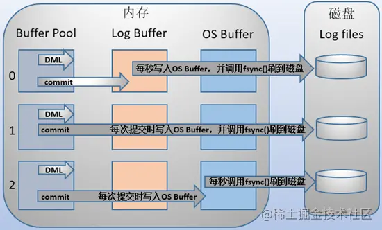 还可以同时调用 flush + fsync, 将缓存直接落盘。innodb_flush_log_at_trx_commit = 0就是每秒调用 flush + fsync ,定时器自己维护。innodb_flush_log_at_trx_commit = 1就是实时调用 flush + fsync 没法批处理,性能很低。innodb_flush_log_at_trx_commit = 2就是实时flush ,定时 fsync 交给OS维护定时器。