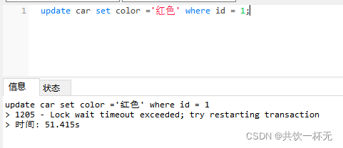 期间如果并未杀掉持有锁的线程:则第二个update语句会提示等待锁超时。