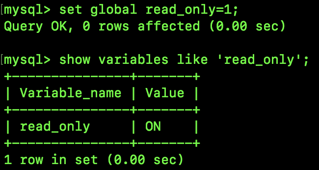 可以看到,默认情况下,read_only 是 OFF,即关闭状态,我们先把它改为 ON,执行如下 SQL: