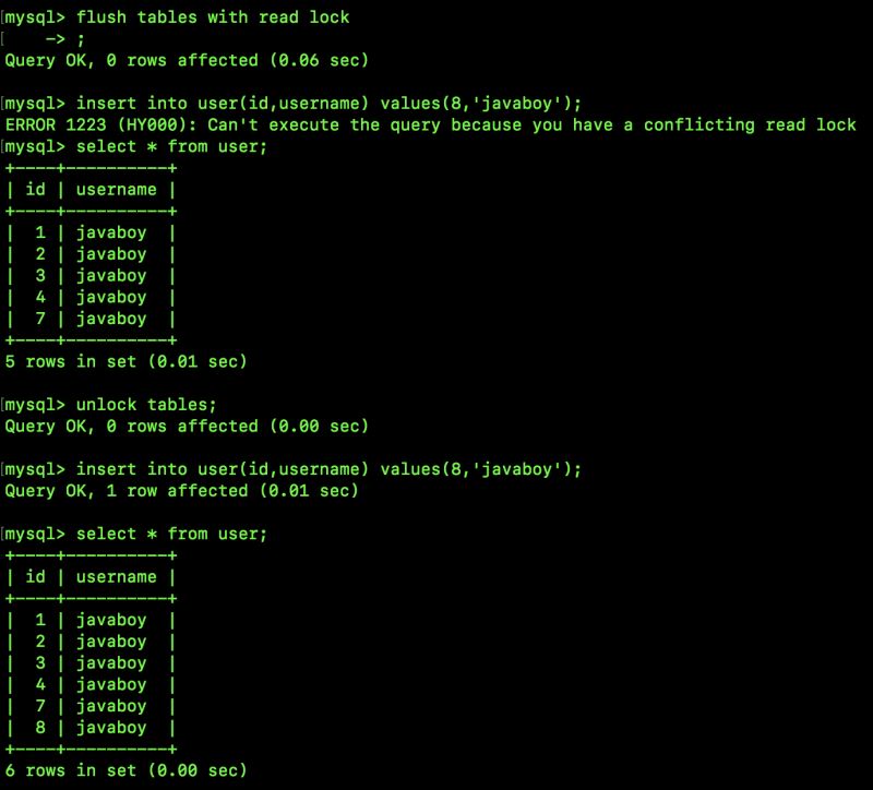 从图中可以看到,使用 flush tables with read lock; 指令可以锁定表;使用 unlock tables; 指令则可以完成解锁操作(会话断开时也会自动解锁)。