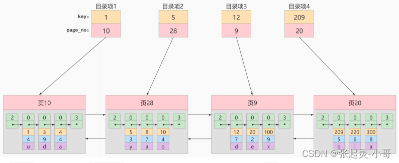 下一个数据页中用户记录的主键值必须大于上一个页中用户记录的主键值。 给所有的页建立一个目录项。