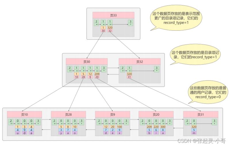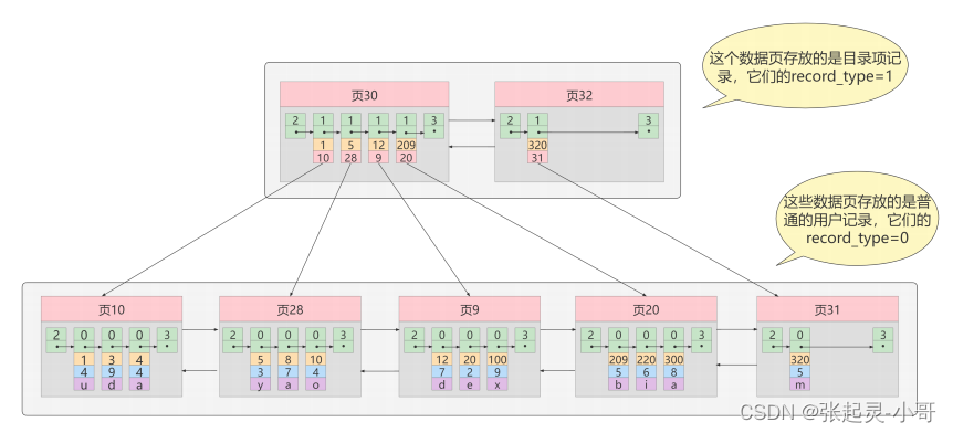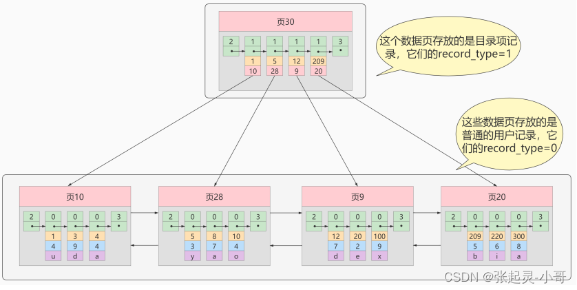 从图中可以看出来,我们新分配了一个编号为 30 的页来专门存储目录项记录。这里再次强调 目录项记录 和普通的 用户记录 的 不同点 :