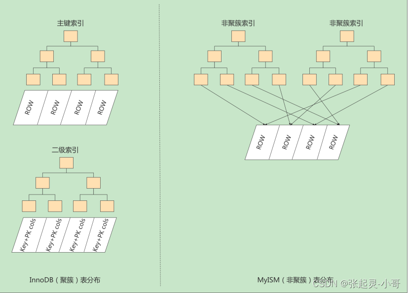 相同点: 两者用的是一样的数据页,都会为主键值生成 Page Directory (页目录),从而在按照主键值进行查找时可以使用 二分法 来加快查询速度。