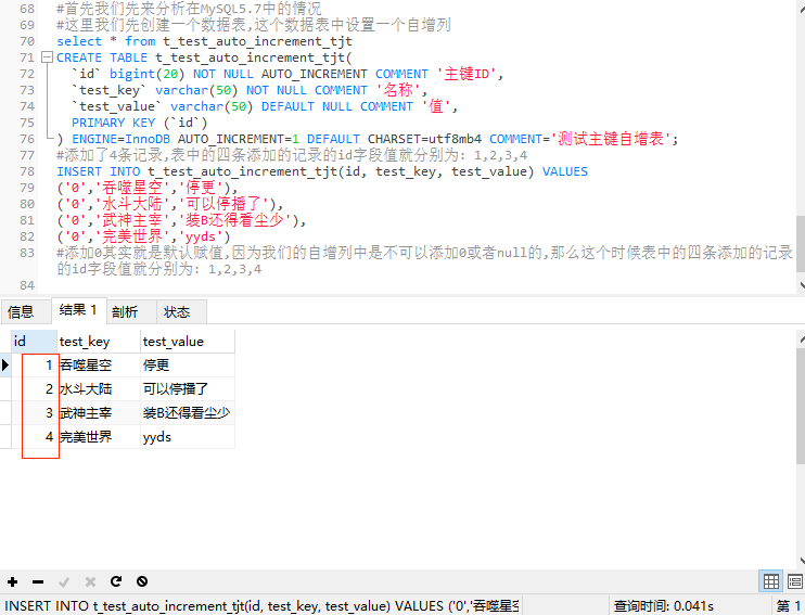 插入数据的SQL添加的是0,其实就是默认赋值,表 t_test_auto_increment_tjt 中的自增列是不可以添加0或者null的,那么这个时候表中的四条添加的记录的id字段值就分别为: 11、2、3、4。