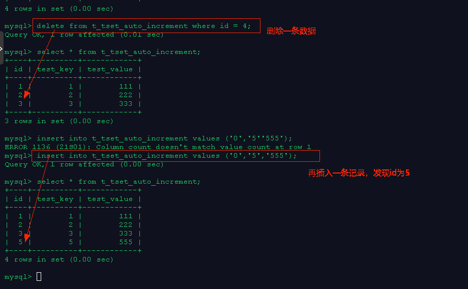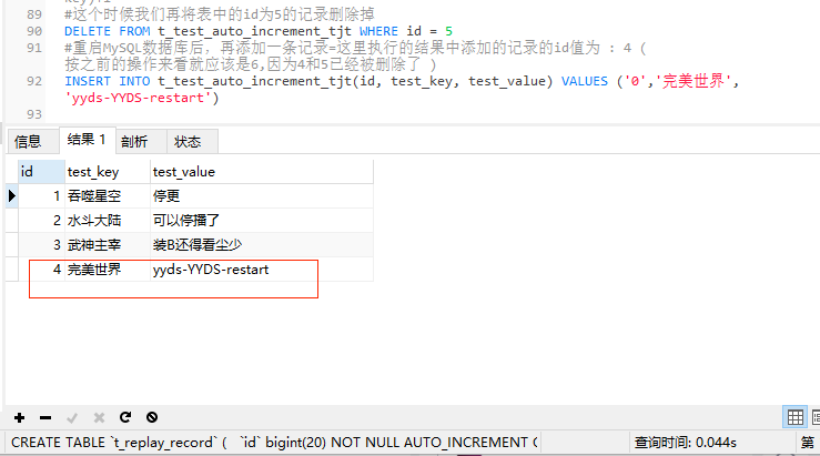 上图可以看到,重启后 重启后 重启后 执行的结果中添加的记录的id值为 : 4, 按之前的操作来看4和5已经被删除了,那么添加的就应该是6,为什么是4呢?