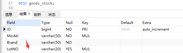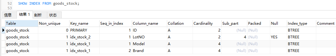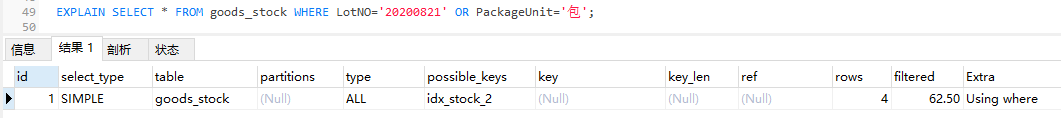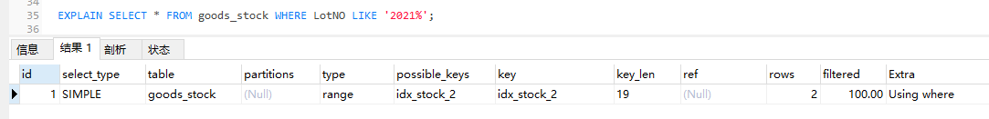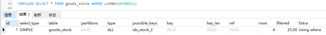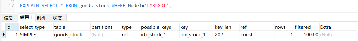 通过命令可以看到goods_stock库存表有两个索引,然后我们再执行如下语句看是否使用索引: