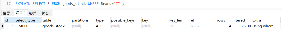 EXPLAIN SELECT * FROM goods_stock WHERE Brand='TI';
