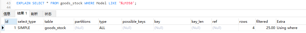 EXPLAIN SELECT * FROM goods_stock WHERE Model LIKE '%LM358';