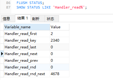 如果索引正在工作,Handler_read_key的值将很高,这个值代表了一个行被索引值读的次数,很低的值表明增加索引得到的性能改善不高,因为索引并不经常使用。Handler_read_rnd_next的值高则意味着查询运行低效,并且应该建立索引补救。这个值的含义是在数据文件中读下一行的请求数。如果正进行大量的表扫描,Handler_read_rnd_next的值较高,则通常说明表索引不正确或写入的查询没有利用索引。可以先刷新状态再查询,具体如下: