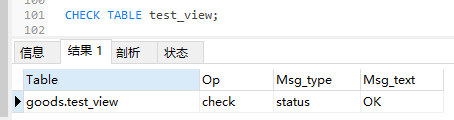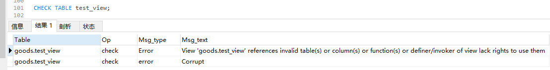 CHECK TABLE也可以检查视图是否有错误,比如在视图定义中被引用的表已不存在,举例如下: