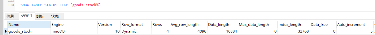 -- 先查看下goods_stock库存表是什么表类型 SHOW TABLE STATUS LIKE 'goods_stock%';