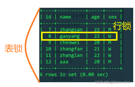而我们用name作为过滤条件没有用到索引,自然就不会使用行锁,而是使用表锁。这就意味着只有通过索引检索数据,InnoDB才使用行级锁,否则InnoDB都将使用表锁!!!