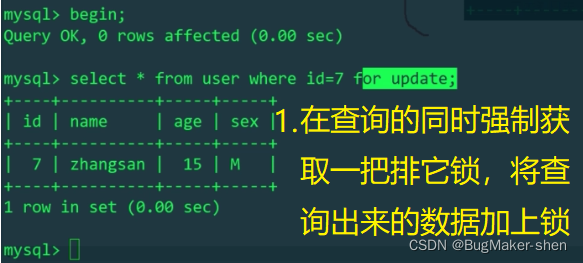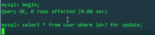 首先开启一个事务,给id=7的数据加上排它锁