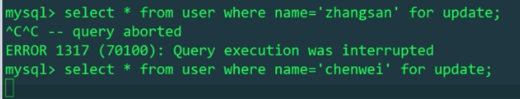 事务2现在同样想获取这条记录的排它锁,可想而知地失败了;那现在事务2获取chenwei的记录的排它锁,试试能不能成功