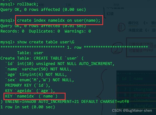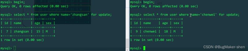 我们发现,给name加上索引后,两个事务可以获取到不同行的排它锁(for update),再一次证明了InnoDB的行锁是加在索引项上的