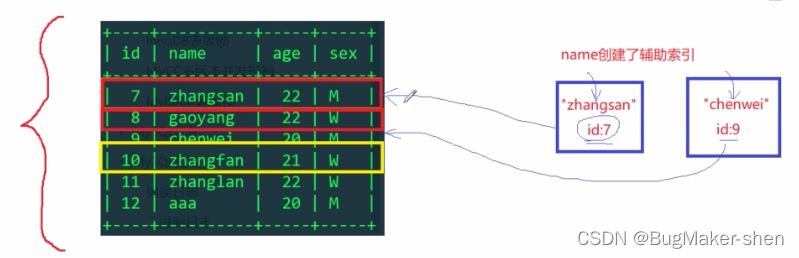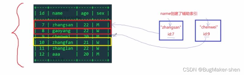 因为现在name走的是索引, 通过zhangsan在辅助索引树上找到它所在行记录的id是7,然后到主键索引树上,获取对应行记录的排他锁(个人猜测应该是辅助索引树和主键索引树相应的记录都加了锁)