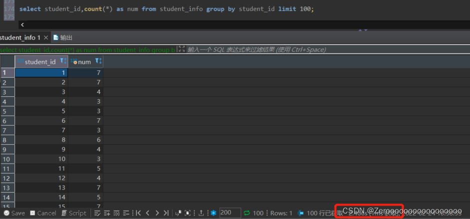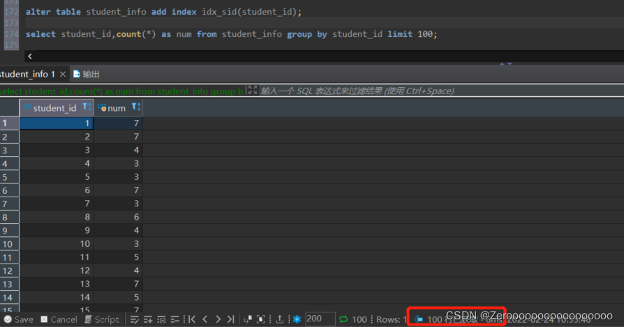 select student_id,count(*) as num from student_info group by student_id limit 100;#花费2.466s