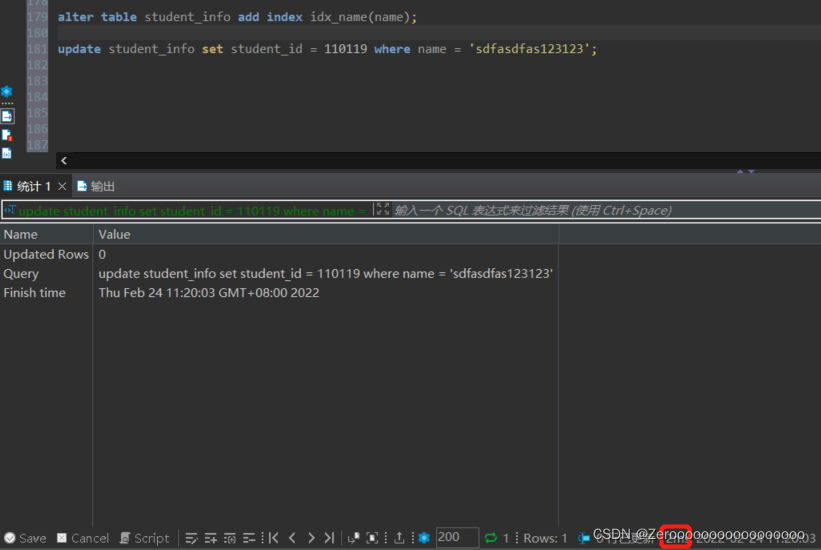 alter table student_info add index idx_name(name); update student_info set student_id = 110119 where name = 'sdfasdfas123123';#花费2ms