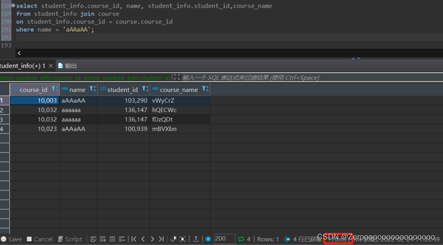 select course_id, name, student_info.student_id,course_name from student_info join course on student_info.course_id = course.course_id where name = 'aAAaAA'; #花费176ms