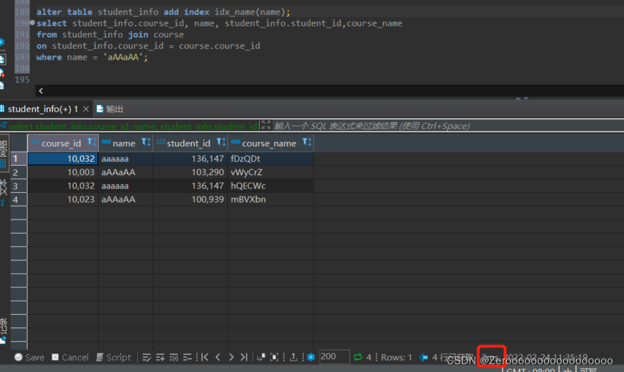alter table student_info add index idx_name(name); select course_id, name, student_info.student_id,course_name from student_info join course on student_info.course_id = course.course_id where name = 'aAAaAA'; #花费2ms
