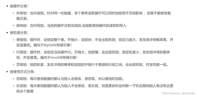 第四是安全问题,这里可以参考线程的安全问题,比如怎么解决高并发访问??如何能保证事务的完整性?? 像RocketMQ也涉及事务消息, 如何避免这类问题, 我们可以上锁。 以下是锁的分类。