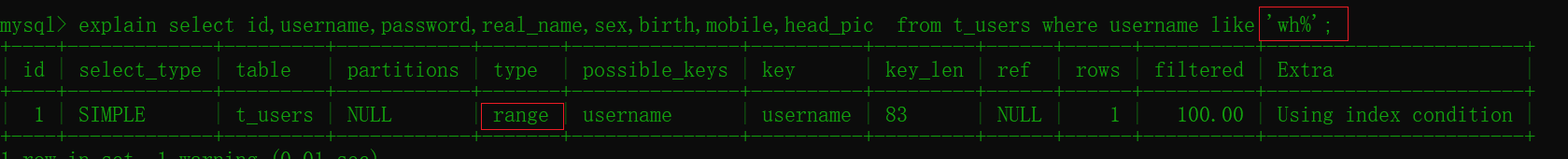 explain select id,username,password,real_name,sex,birth,mobile,head_pic from t_users where username like 'wh%';