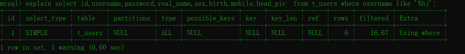 explain select id,username,password,real_name,sex,birth,mobile,head_pic from t_users where username like '%h%';