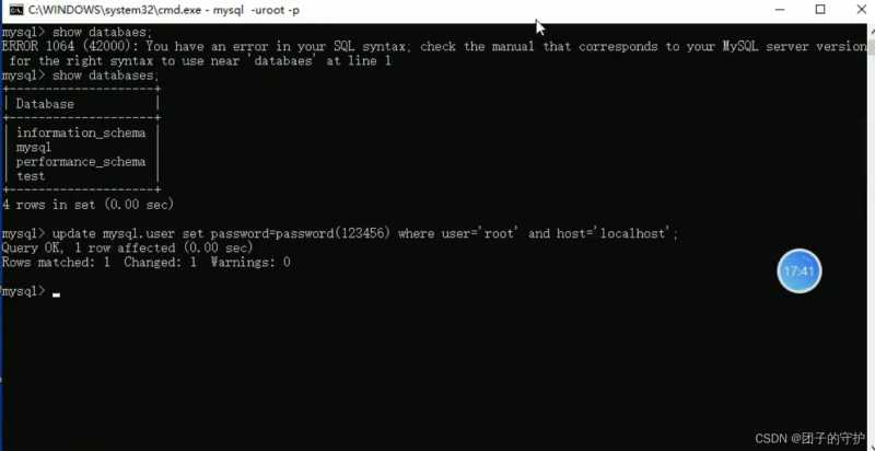 重新打开一个普通cmd启动mysql输入新密码即可