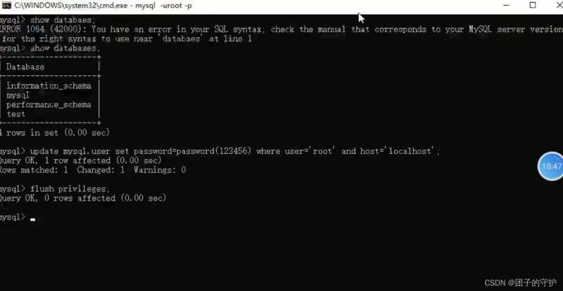 # 4、立刻将修改数据刷到硬盘 # flush privilegse;