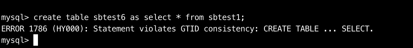 如:使用CREATE TABLE AS SELECT语法在GTID模式下不支持,而ENFORCE_GTID_CONSISTENCY设置为WARN时,只会在错误日志提示,不会直接报错,