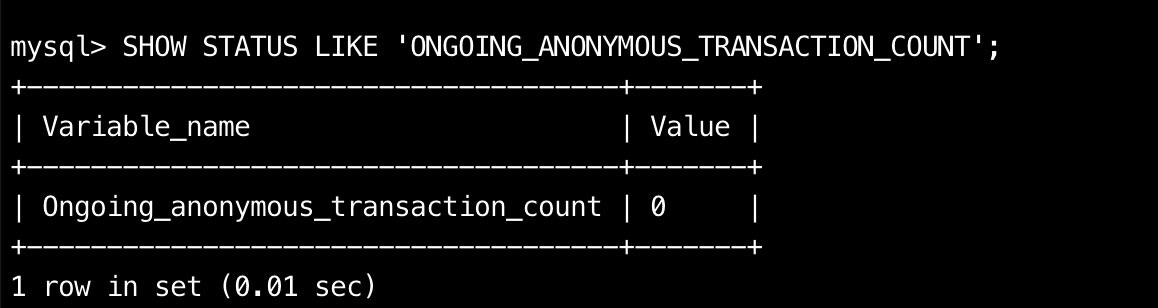 ## 该操作仅在从库执行即可 ## 方式1:确保该状态值输出的匿名事务数显示为0(注意:只要出现过0即可表示已经转换完成,即使后续该状态值从0变为了大于0的值也不影响) SHOW STATUS LIKE 'ONGOING_ANONYMOUS_TRANSACTION_COUNT'; ## 在从库上多次执行该语句 ## 方式2: 查询该视图中LAST_SEEN_TRANSACTION可以观测当前同步的事务是否还存在ANONYMOUS事务 select * from performance_schema.replication_applier_status_by_worker;