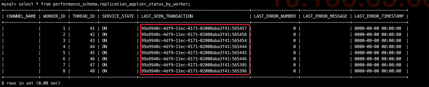 ## 该操作在从库执行即可 SELECT @@GLOBAL.GTID_OWNED; select * from performance_schema.replication_applier_status_by_worker;