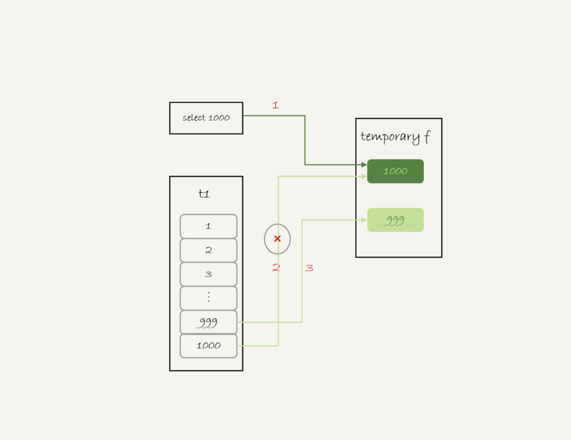 - 从内存临时表中按行取出数据,返回结果,并删除内存临时表,结果中包含id=1000和id=999两行